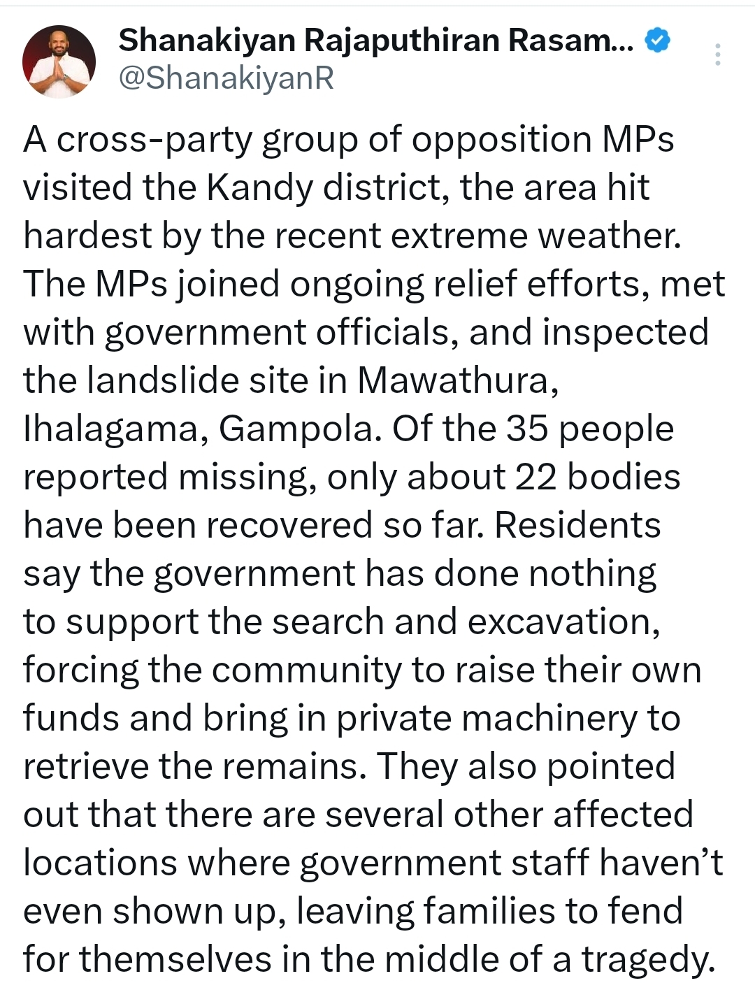 The delegation joined ongoing relief efforts, met with local authorities, and inspected the major landslide site in Mawathura, Ihalagama, Gampola. Officials and residents told the MPs that of the 35 people initially reported missing, only about 22 bodies have been recovered so far.