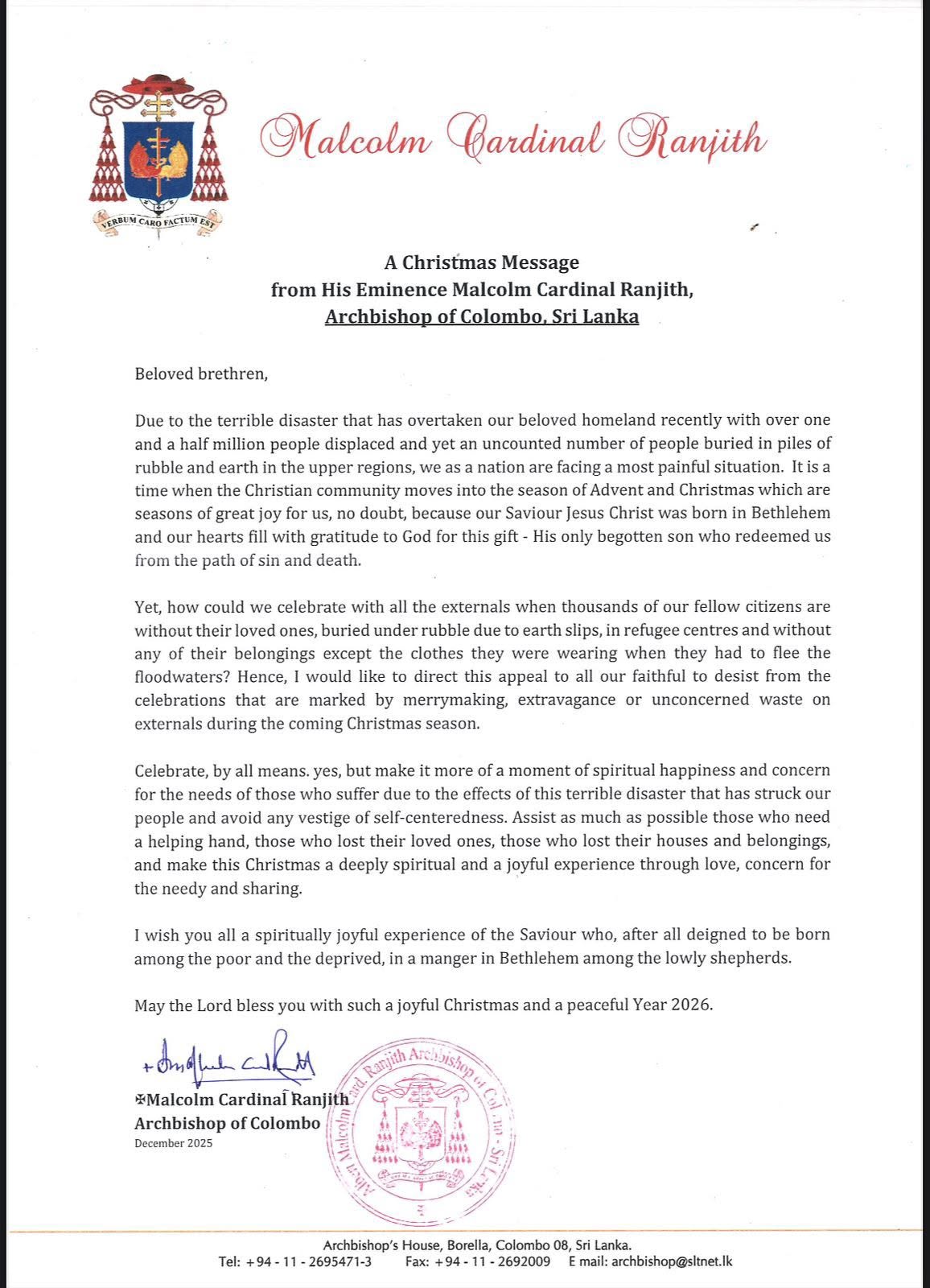 The Archbishop of Colombo, Cardinal Malcolm Ranjith, has urged Sri Lankans to mark this Christmas with compassion and restraint as the country continues to grapple with the aftermath of one of its worst natural disasters in recent history.