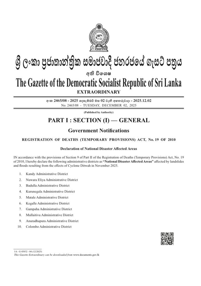 The gazette has been issued in accordance with the provisions of Section 9 of Part II of the Registration of Deaths (Temporary Provisions) Act, No. 19 of 2010, dated 02 December 2025. (Newswire)