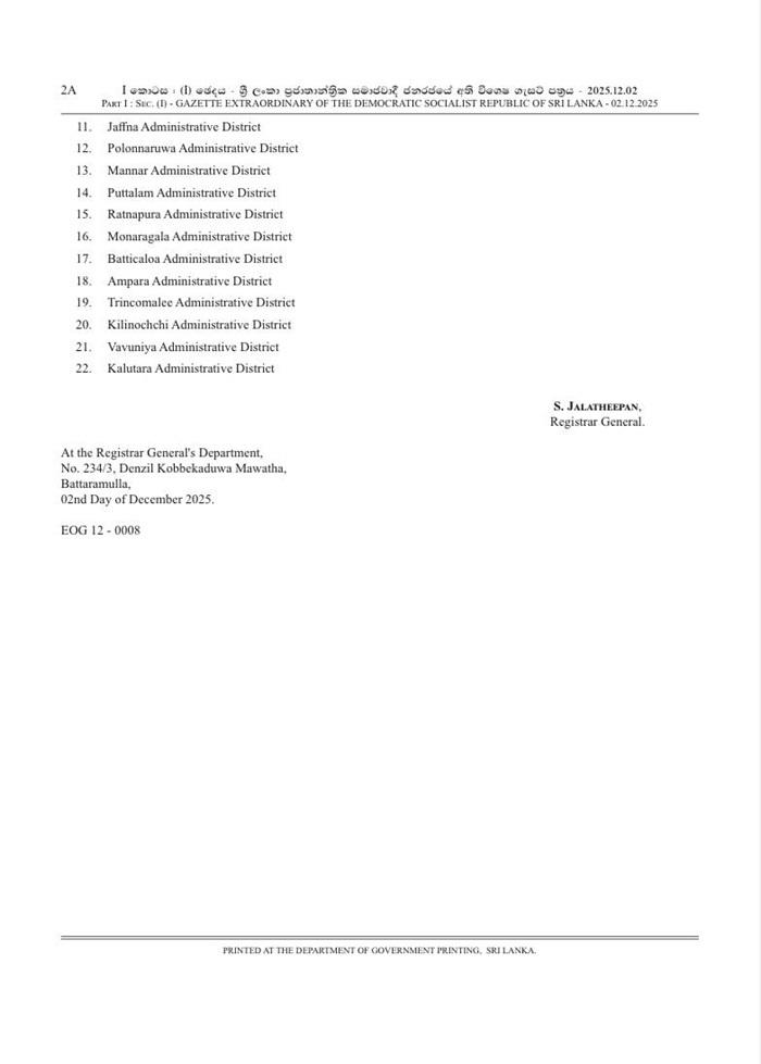 A special Gazette notification has been issued designating 22 districts affected by landslides and floods caused by Cyclone Ditwah as national disaster areas.