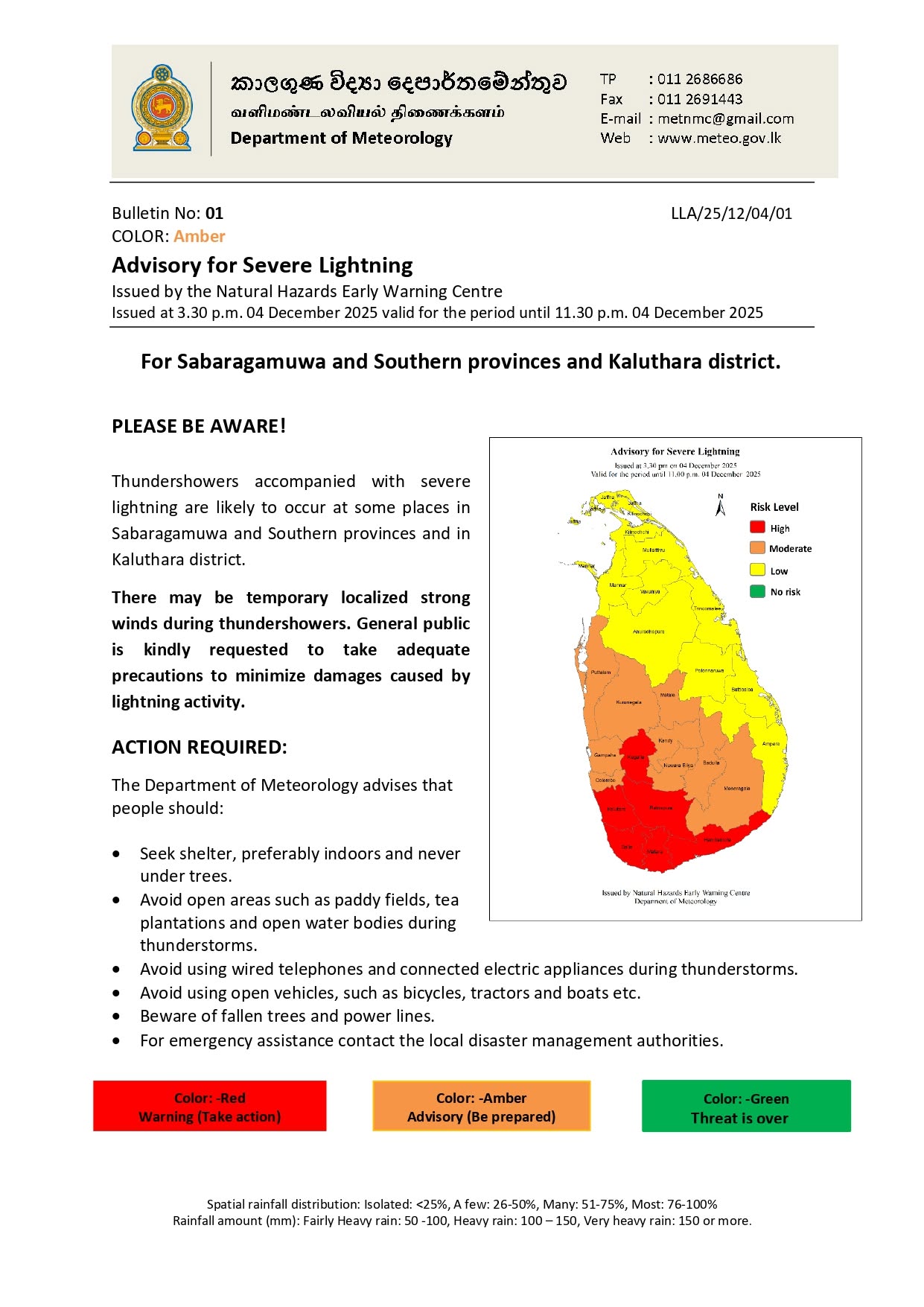 Advisory for Severe Lightning Issued by the Natural Hazards Early Warning Centre Issued at 3.30 p.m. 04 December 2025 valid for the period until 11.30 p.m. 04 December 2025 2025-12-04