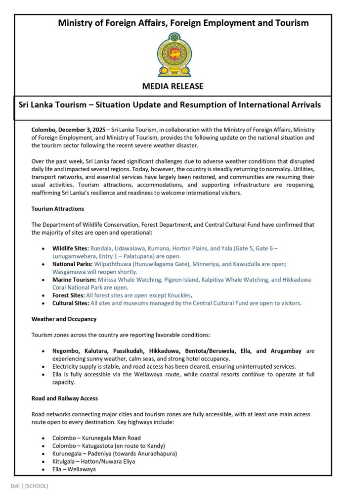 Sri Lanka Tourism has announced the reopening of several tourist attractions, reporting the country’s return to normalcy following Cyclone Ditwah.