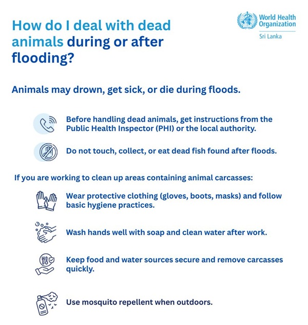 The World Health Organization (WHO) Sri Lanka has released public health guidance on how to safely manage dead animals found during or after flood events, in the wake of recent flooding across Sri Lanka.