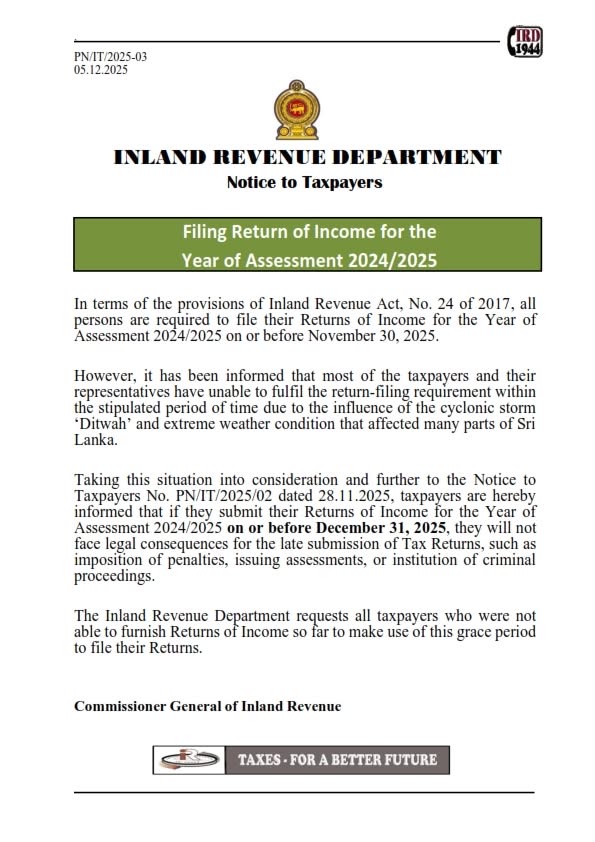 The Inland Revenue Department (IRD) has extended the deadline for filing Returns of Income for the 2024/2025 assessment year, following widespread disruptions caused by Cyclone Ditwah and severe weather across the country.