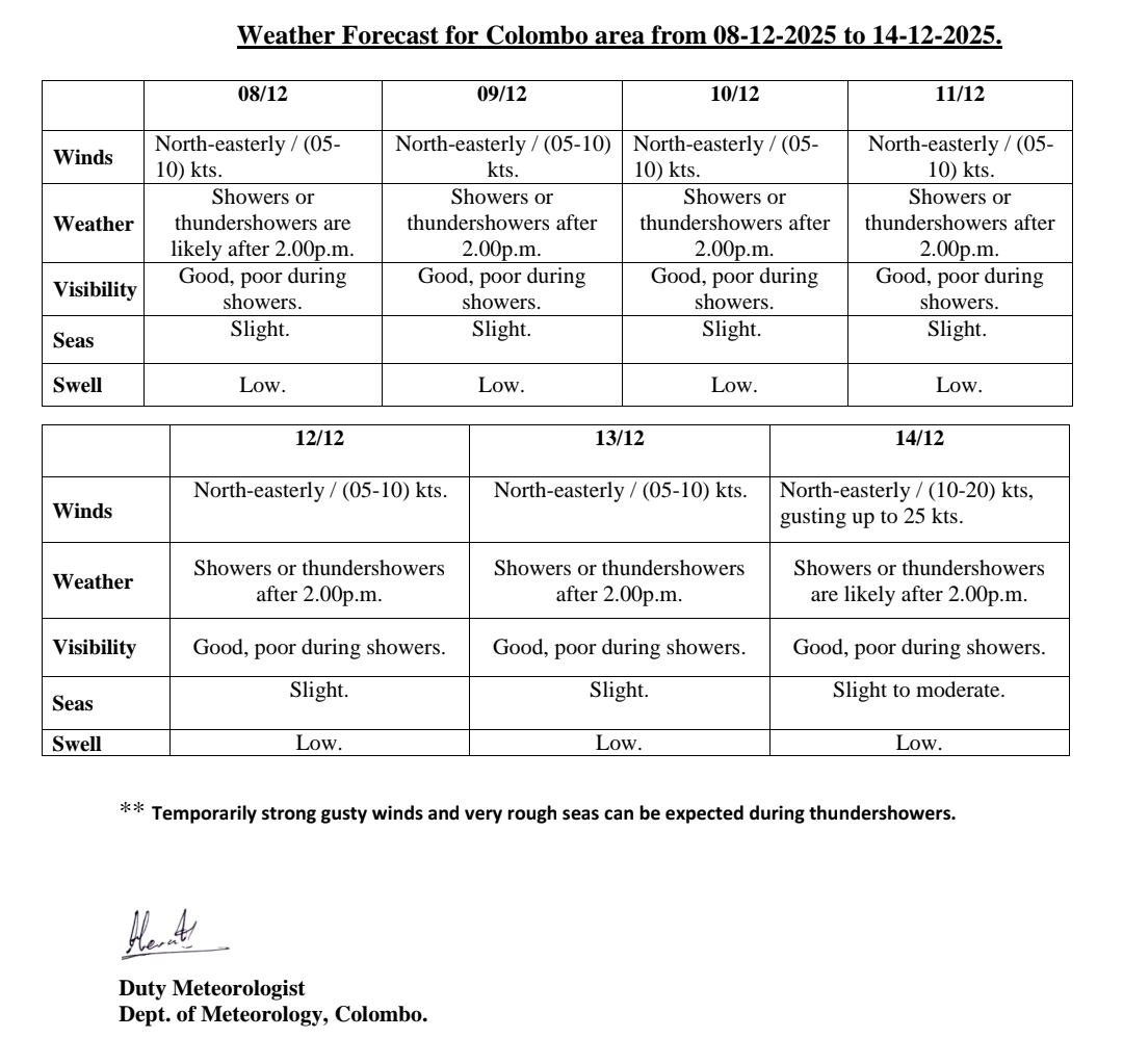 The Department of Meteorology says the Colombo area is likely to experience showers or thundershowers on most days during the period from 8 to 14 December, mainly after 2.00 p.m.