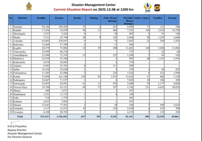 According to the Disaster Management Centre, 192 people remain missing due to the impact of Cyclone Ditwah.