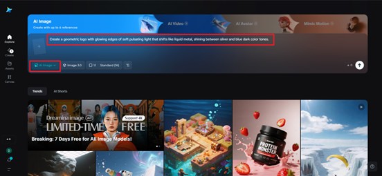 To design a living logo, begin by visiting Dreamina and entering a descriptive prompt that sets the mood. Describe the textures, moods, and adaptive qualities you want. The more descriptive the specifications, the more fluid and adaptive the result will be.