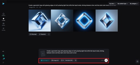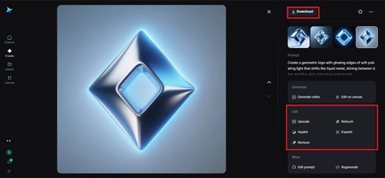 Having received your results, you can begin customizing them to refine the parameters to your liking. Use inpaint to modify items, use expand to produce glowing variations, use remove to eliminate distractions, or use retouch to refine effects like shine or motion. Once you are happy with this evolving look, you can download the mark that feels alive and ready to breathe across your channels.