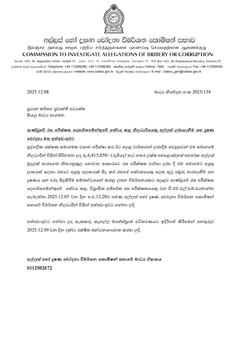 A retired officer of the Government Analyst’s Department was arrested on Dec. 5 by officials from the Commission to Investigate Allegations of Bribery or Corruption over allegations of accepting a bribe totalling Rs. 6,415,050.