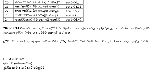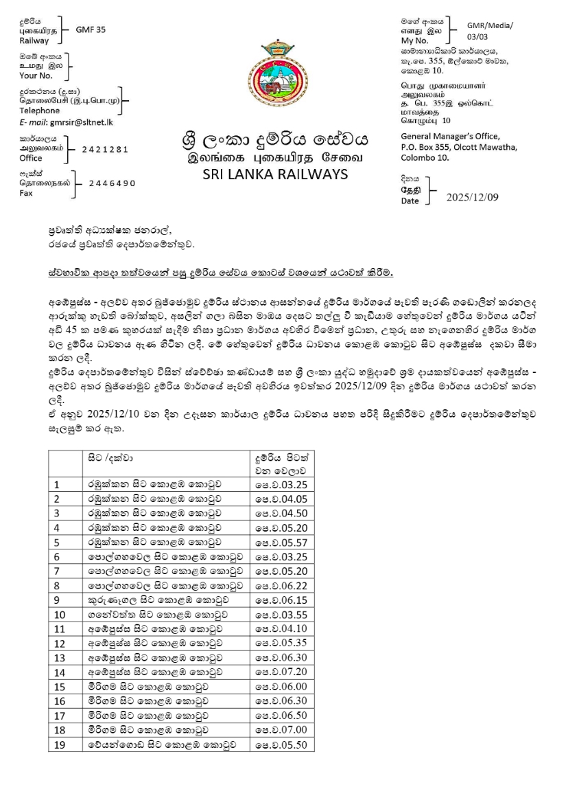 Sri Lanka Railways announced that several train services will resume from tomorrow (10) following repairs carried out between Ambepussa and Alawwa.