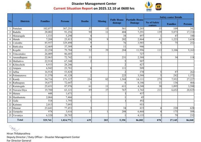 Meanwhile, 203 persons are reported missing due to the landslides and floods triggered by Cyclone Ditwah in Sri Lanka.