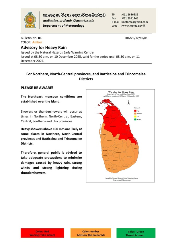 The Department of Meteorology has issued an advisory for heavy rain in the Northern and North-Central Provinces, and the Batticaloa and Trincomalee Districts today.