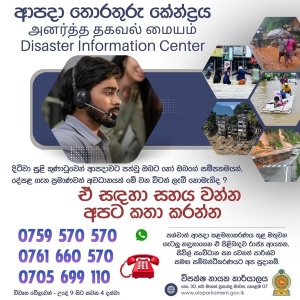 A Disaster Information Centre was launched by Opposition Leader Sajith Premadasa this morning (10 Dec) at the Opposition Leader’s Office located in Colombo, to collect information from areas affected by adverse weather conditions.