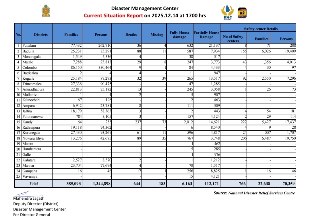 At least 644 people have died and 183 remain missing due to the ongoing disaster situation triggered by Cyclone Ditwah and subsequent floods and landslides across Sri Lanka, according to the latest situation report issued by the Disaster Management Centre (DMC).