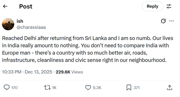 Taking to X, the user, identified as Ish, said he felt numb after landing back in Delhi following a trip to Sri Lanka. In his post, he reflected on what he described as a stark contrast between the two countries.