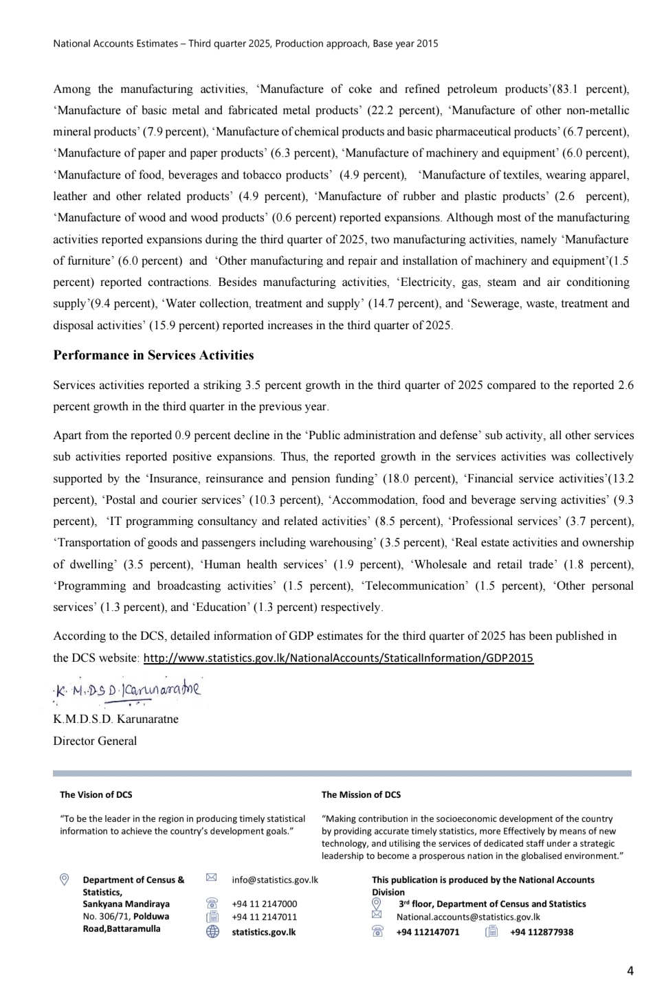 Sri Lanka’s economy grew by 5.4 percent in the third quarter of 2025, driven by positive performance across agriculture, industry and services, according to the Department of Census and Statistics .
