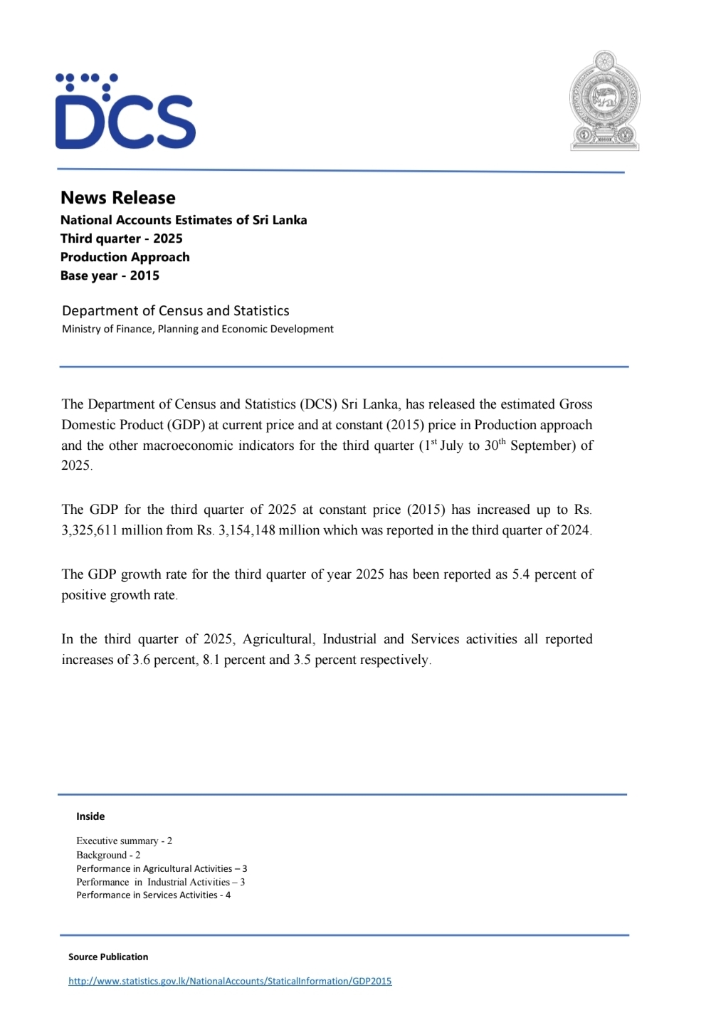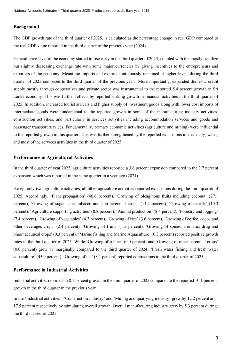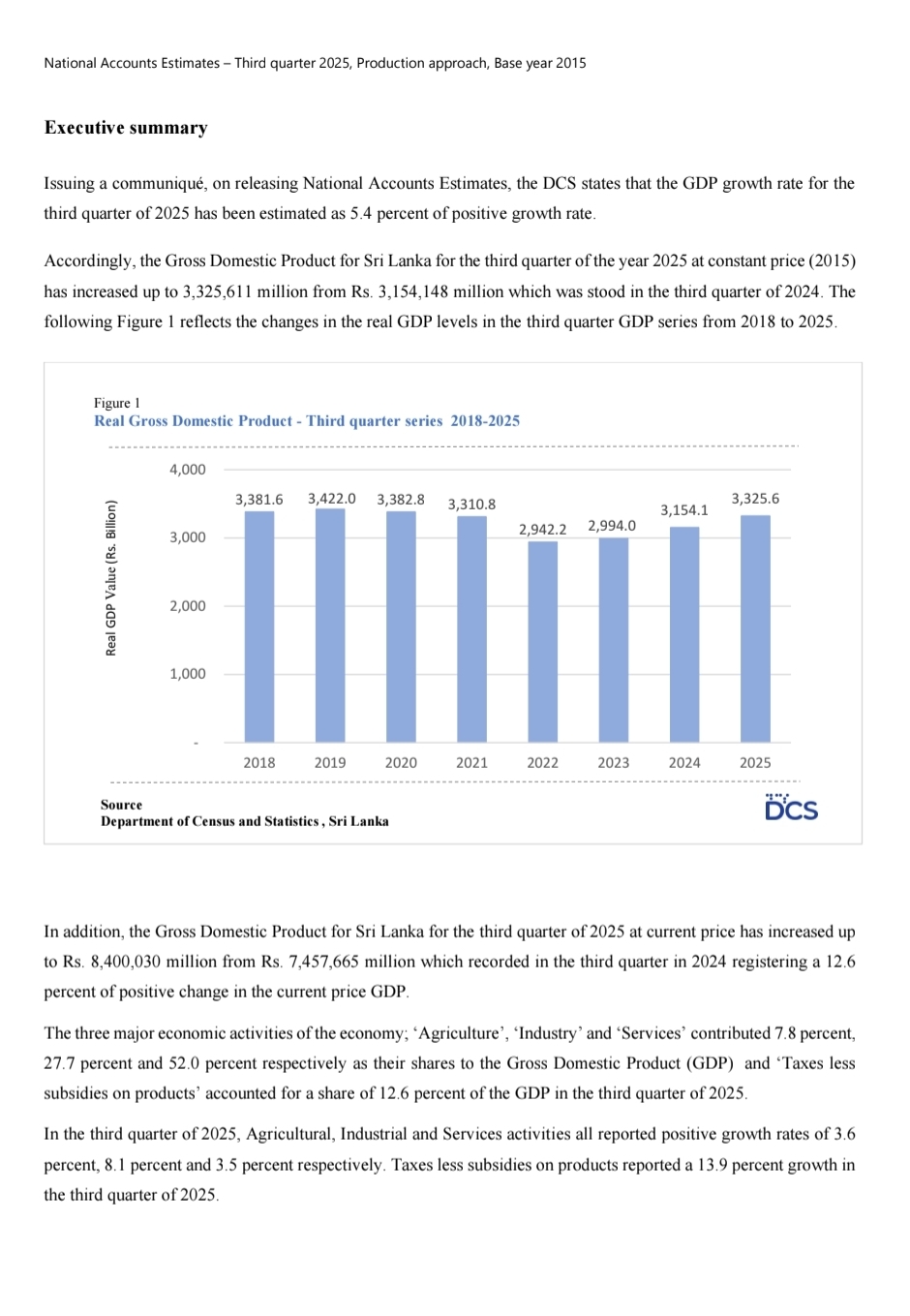 Sri Lanka’s economy grew by 5.4 percent in the third quarter of 2025, driven by positive performance across agriculture, industry and services, according to the Department of Census and Statistics .