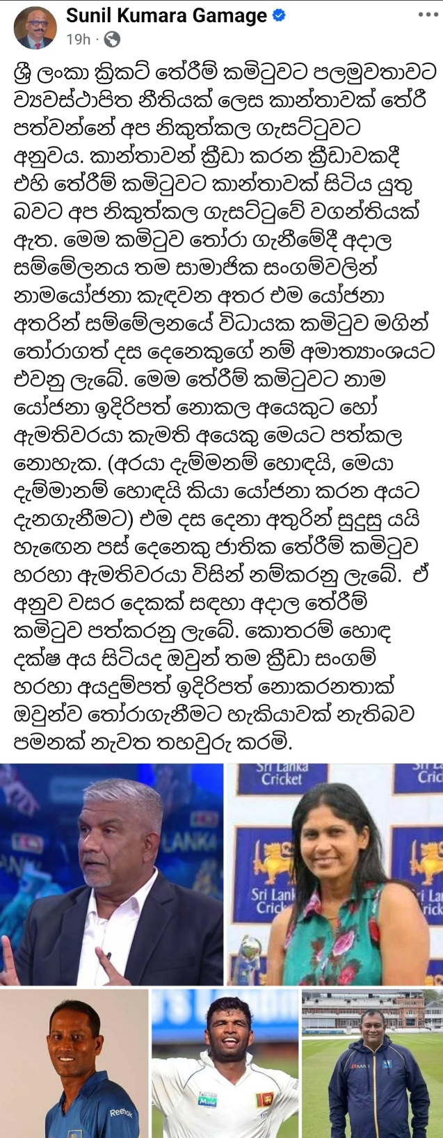 “The minister cannot appoint someone simply because public calls say ‘put him’ or ‘put her,’” Gamage said. He added that even high-profile cricket figures are ineligible for consideration if they are not nominated through their respective member associations and the official board list.