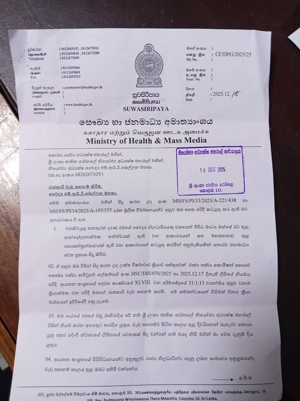 The decision had been communicated via a letter issued under the letterhead of the Ministry of Health, dated 18 December 2025.