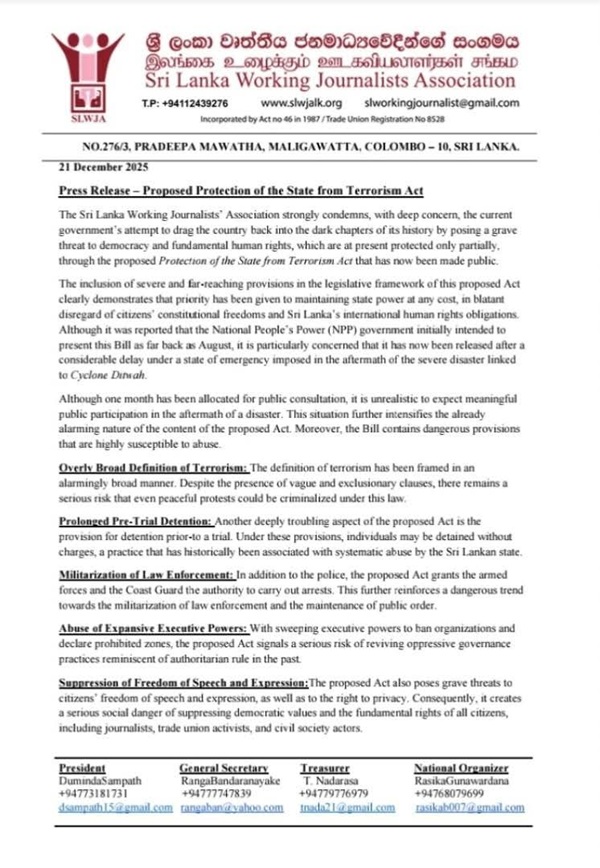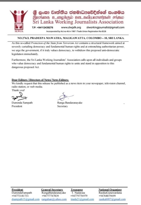 The Sri Lanka Working Journalists Association (SLWJA) has strongly opposed the proposed “Protection of the State from Terrorism Act,” warning that it poses a serious threat to democracy and fundamental human rights.