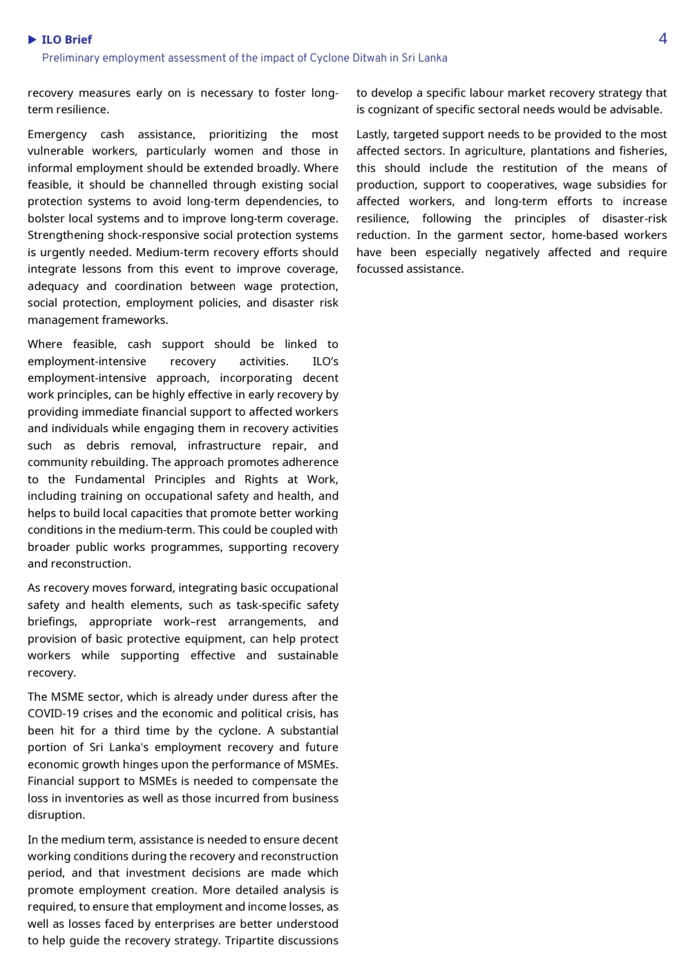 Considering these disastrous conditions, the brief calls for immediate measures to support the restoration of livelihoods. Emergency cash assistance and the widespread rollout of employment-intensive recovery activities that ensure decent working conditions should be prioritized in the short -term, combined with specific sectoral support and assistance to MSMEs to swiftly restore means of production. Such programmes must prioritize the most vulnerable, be conflict-sensitive, work through workers’ and employers’ organization, and interact directly with community stakeholders. Medium-term recovery efforts should integrate lessons from this event to improve coverage, adequacy and coordination between wage protection, social protection, employment policies, and disaster risk management frameworks. (Newswire)