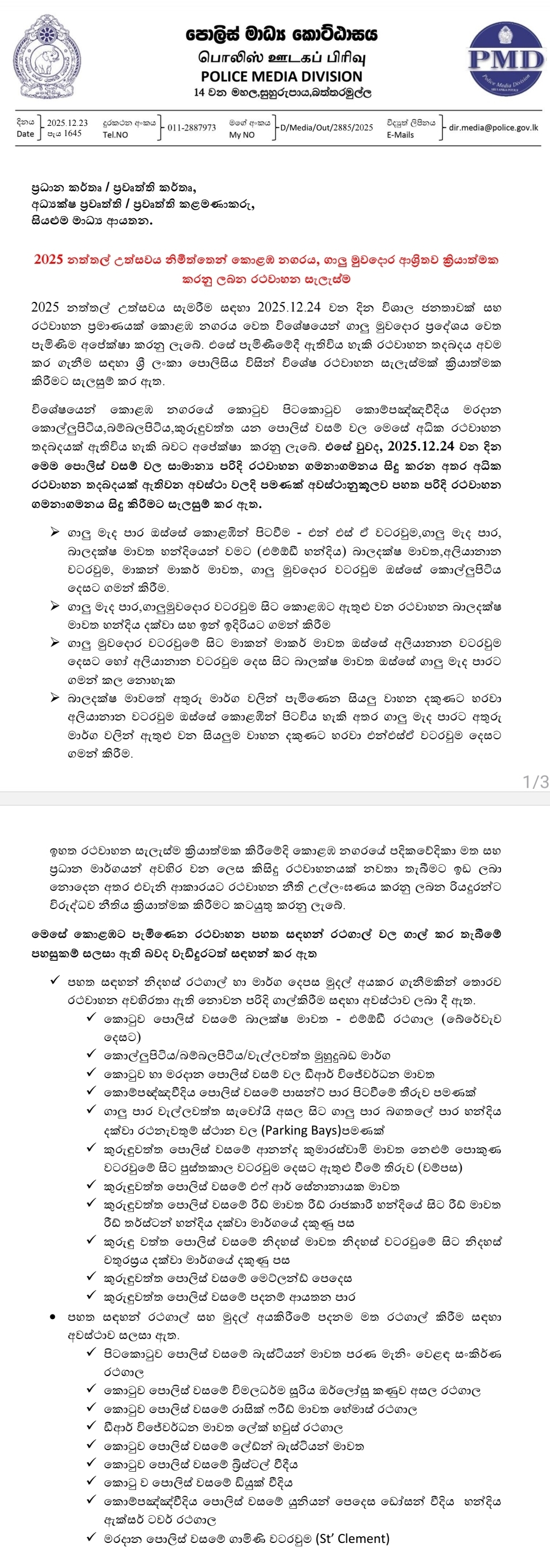 Sri Lanka Police on Tuesday announced a special traffic plan for central Colombo on December 24, anticipating heavy crowds and vehicle congestion as large numbers of people are expected to visit the Galle Face area to celebrate Christmas.