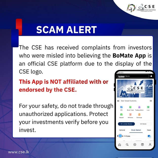 The Colombo Stock Exchange (CSE) has warned investors about the BoMate App, which falsely displayed the CSE logo. The exchange confirmed that the app is not affiliated with or endorsed by the CSE.
