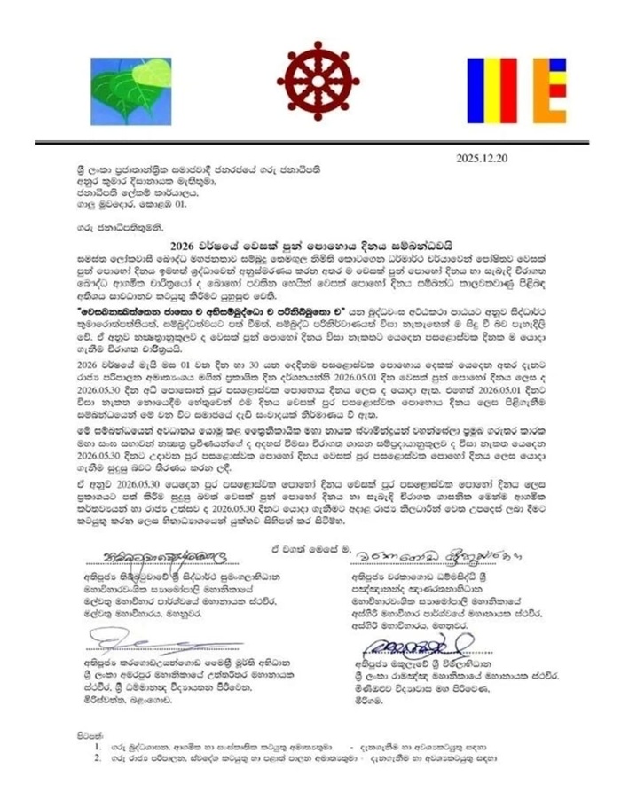 The Chief Prelates of Sri Lanka’s three Buddhist Chapters have sent a letter to President Anura Kumara Dissanayake requesting that the date of Vesak Poya in 2026 be revised.
