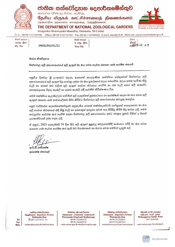 Issuing a statement, the department explained that the suspension was due to the drying up of water in the Ma Oya area, the accumulation of sand and muddy debris at the bathing site, and the presence of hazardous materials such as glass shards and metal fragments within the sand, which posed risks to the elephants.