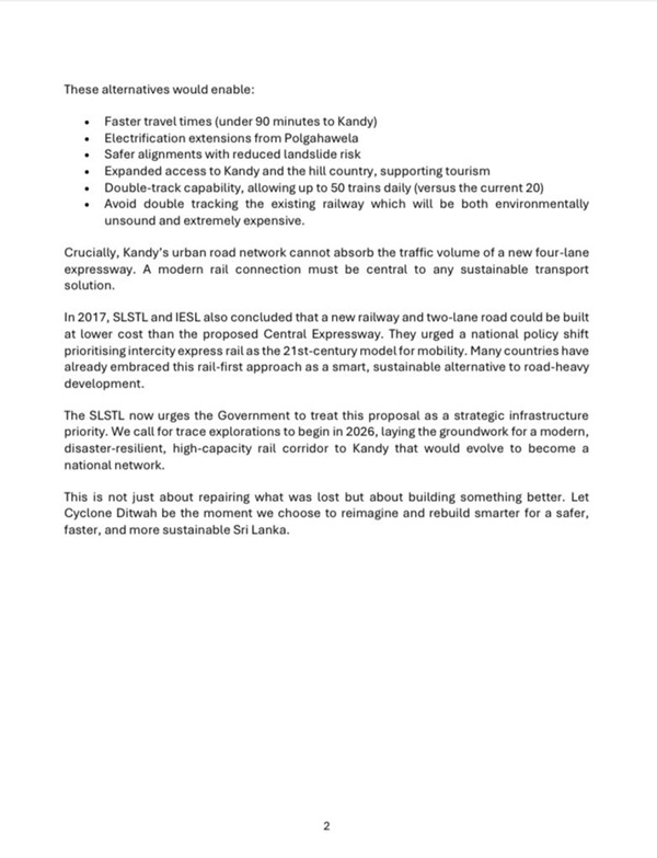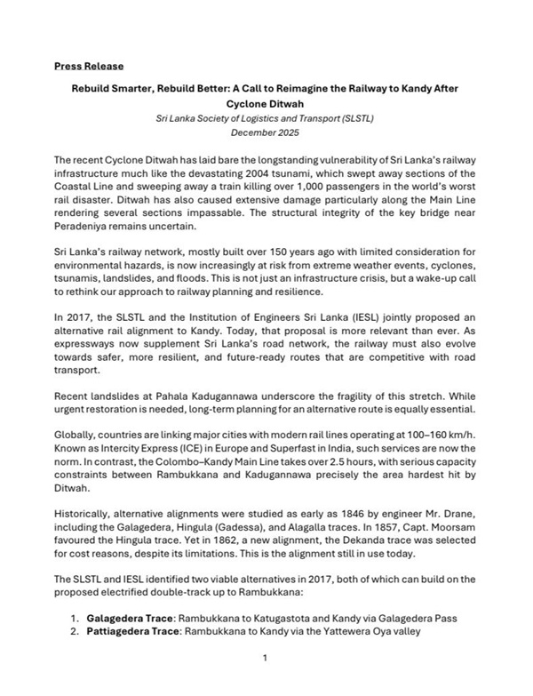The Sri Lanka Society of Logistics and Transport (SLSTL) has renewed its call for the government to prioritize a modern, disaster-resilient rail corridor to Kandy, urging that feasibility studies begin in 2026.