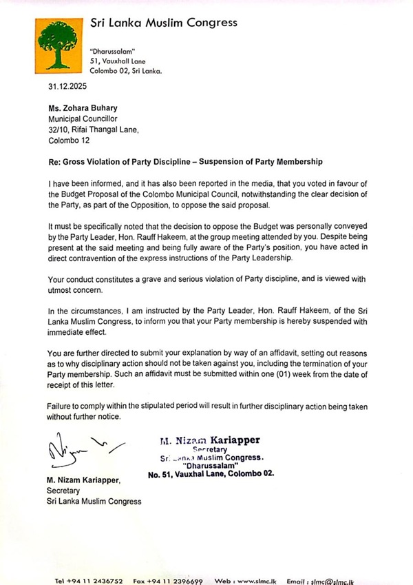 The Sri Lanka Muslim Congress (SLMC) has suspended the party membership of Colombo Municipal Councillor Zohara Buhary with immediate effect, for voting in favour of the Council’s budget.