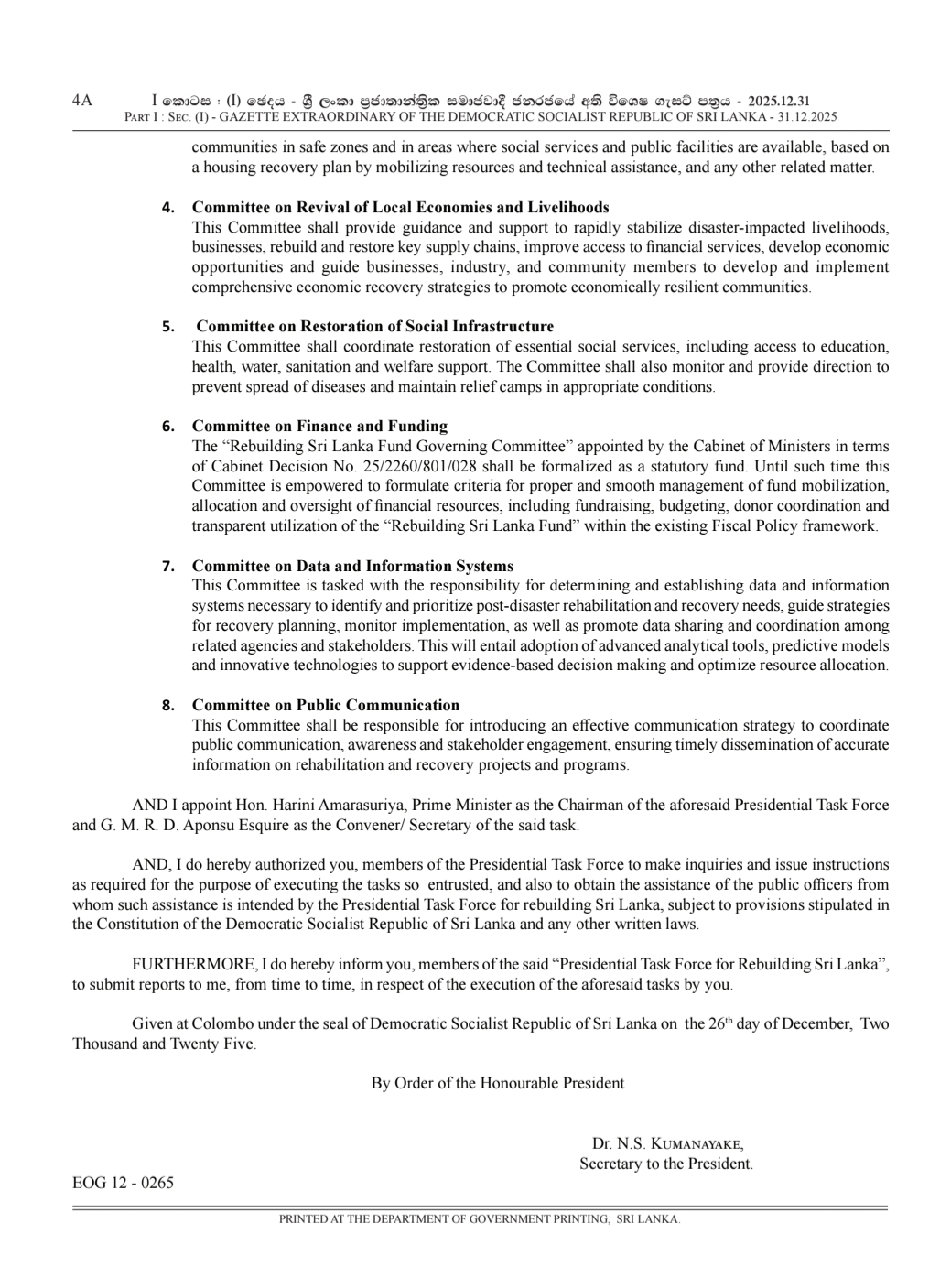 The gazette, dated December 31, appoints Prime Minister Harini Amarasuriya as Chairperson of the Task Force, with a high-level team of Cabinet ministers, deputy ministers, provincial officials and senior public servants named as members