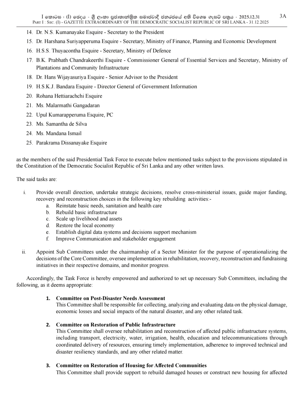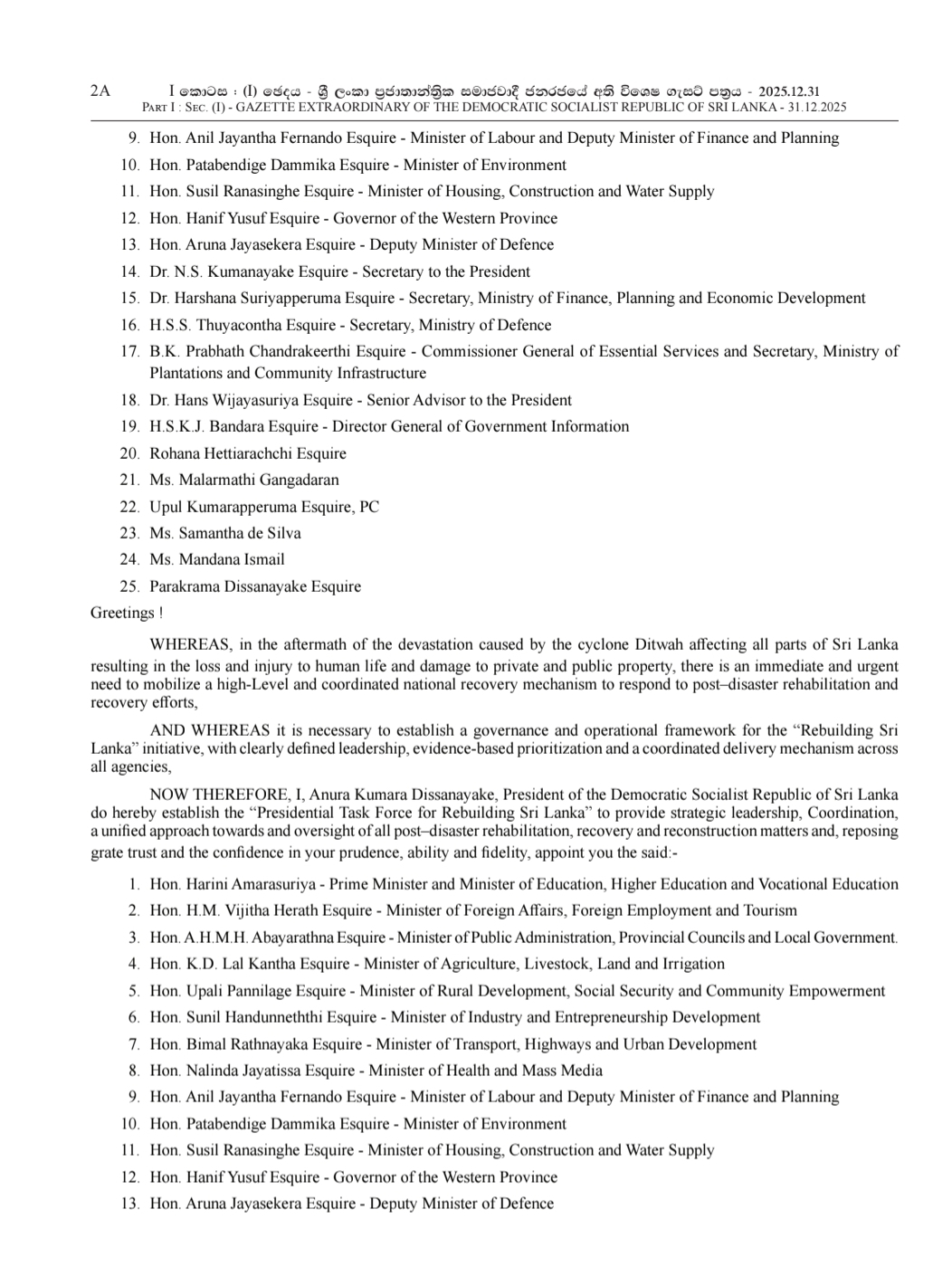 The gazette, dated December 31, appoints Prime Minister Harini Amarasuriya as Chairperson of the Task Force, with a high-level team of Cabinet ministers, deputy ministers, provincial officials and senior public servants named as members