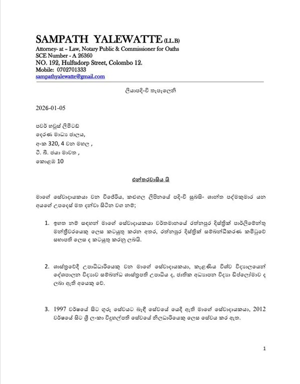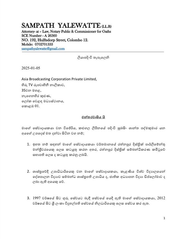 National People’s Power (NPP) MP Shantha Pathma Kumara has sent legal notices to local media institutions, Hiru and Derana, seeking Rs. 3 billion in compensation.