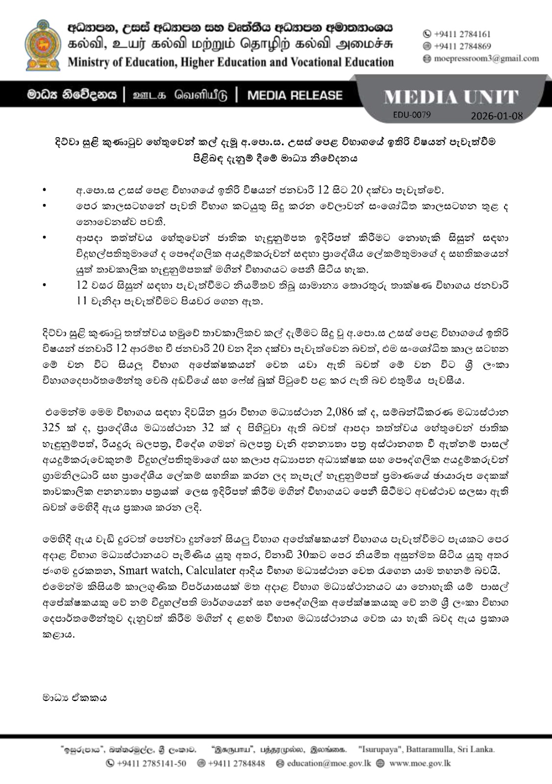 The Department of Examinations announced that the remaining subjects of the 2025 General Certificate of Education Advanced Level (GCE A/L) examination, which were postponed due to the recent disaster situation in the country, will be held from January 12 to January 20, 2026.
