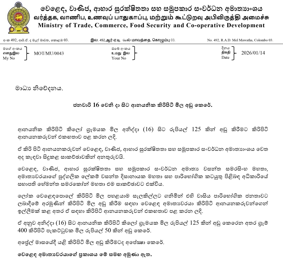 According to the ministry, the price of a 1-kilogram pack of imported milk powder has been reduced by Rs. 125, while the price of a 400-gram pack has been lowered by Rs. 50.