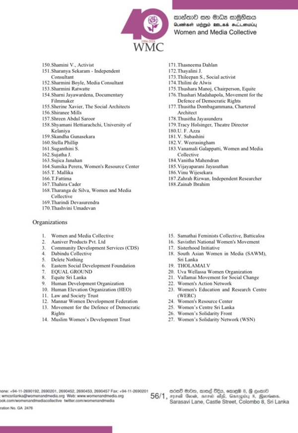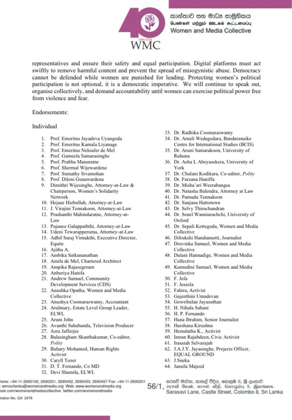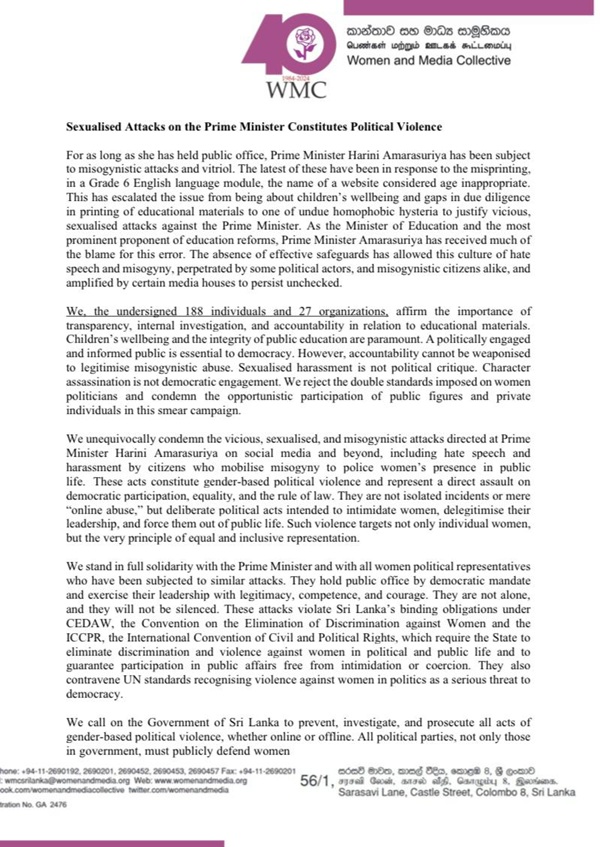 The Women and Media Collective (WMC), together with 188 individuals and 27 organizations, has strongly condemned the sexualised and misogynistic attacks directed at Prime Minister Harini Amarasuriya.