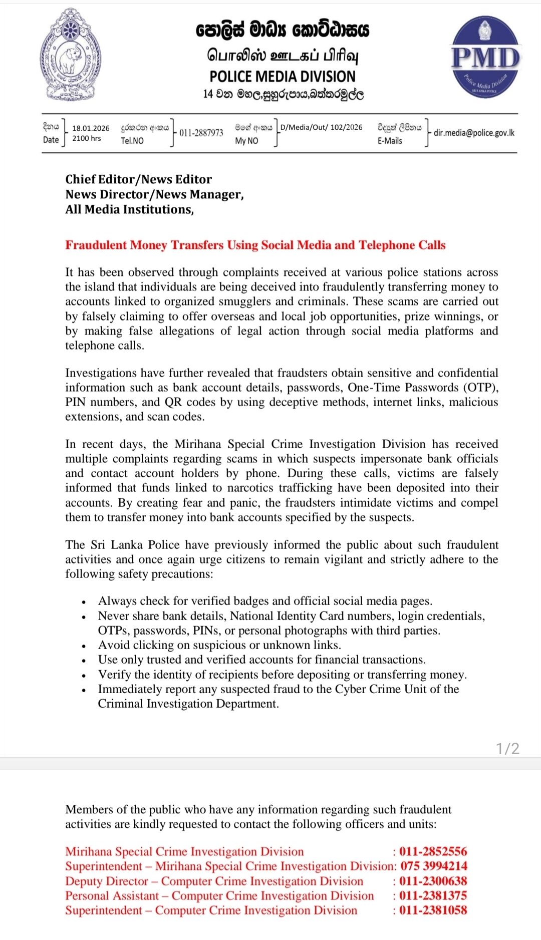 Sri Lanka Police have warned the public of a rise in fraudulent money transfer scams carried out through social media platforms and telephone calls, with victims being deceived into transferring funds to accounts linked to organised criminal networks.