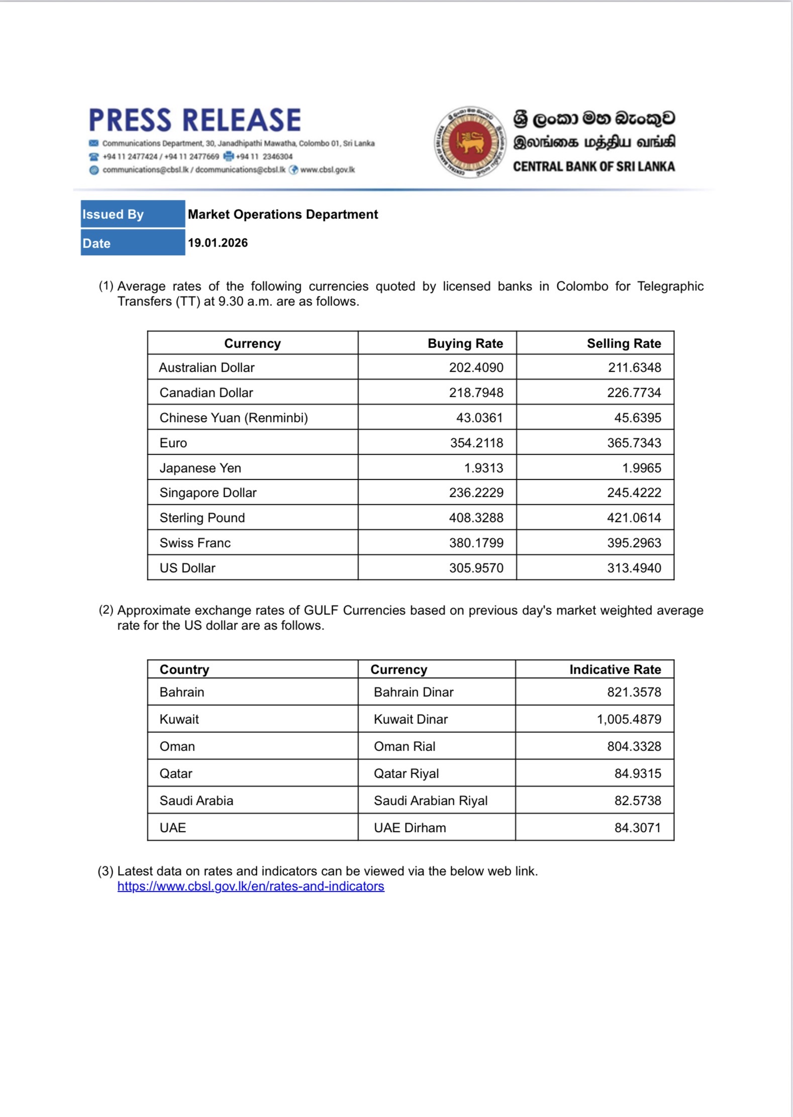 The Sri Lankan Rupee has depreciated further against the US Dollar today (19 Jan) compared to Friday.