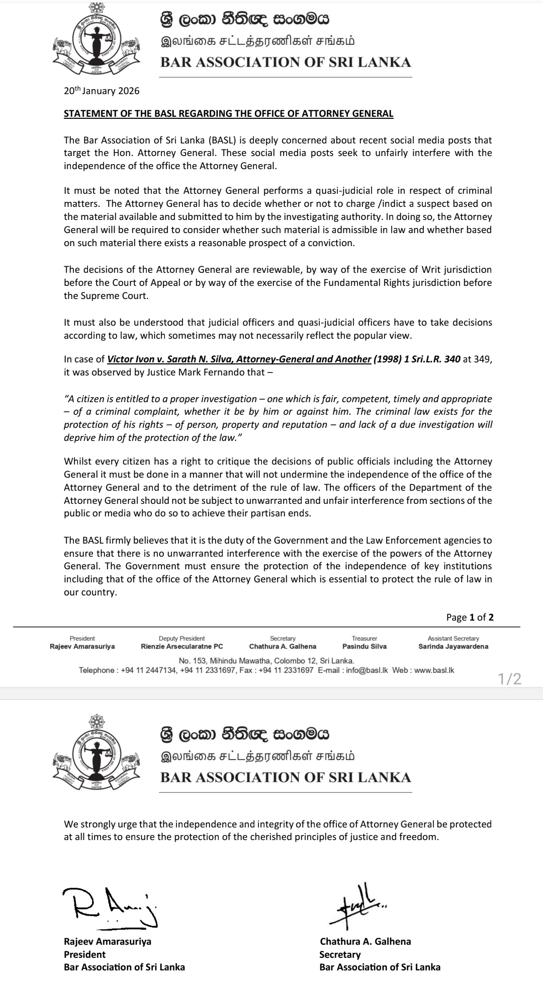In a statement issued on Jan. 20, the BASL warned that recent social media campaigns and public actions targeting the Attorney General risk undermining the independence of the office, which it described as a key pillar of the rule of law .