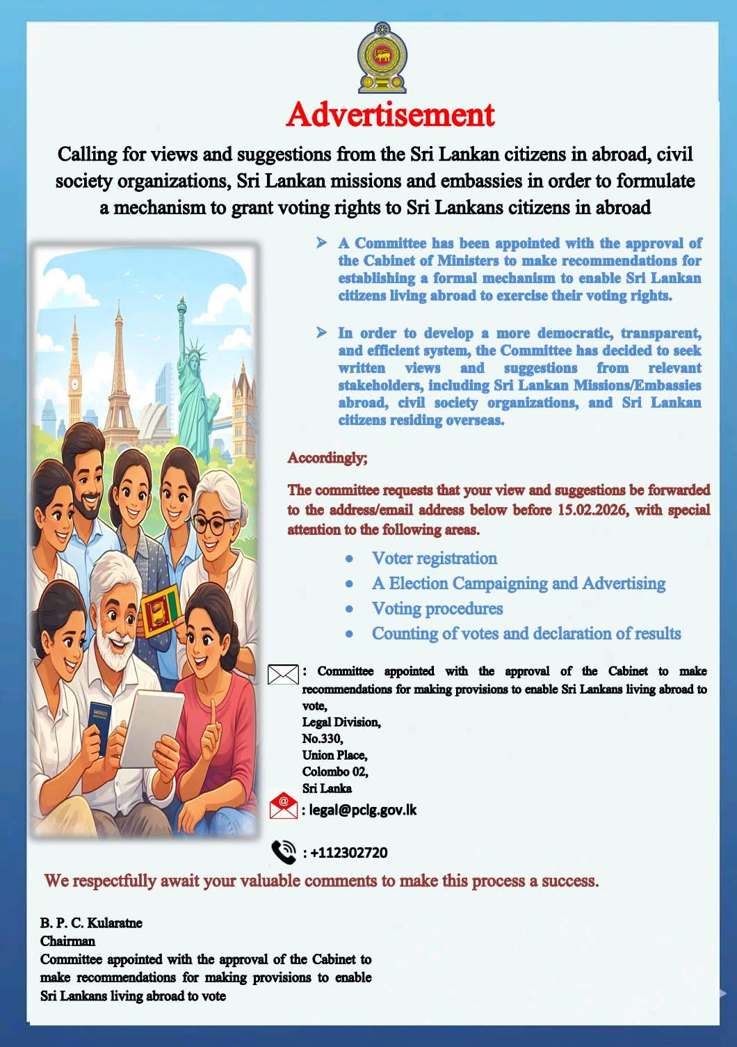 The Sri Lankan government has invited views and suggestions from Sri Lankan citizens living overseas, civil society organizations, and Sri Lankan missions and embassies as part of efforts to establish a mechanism to grant voting rights to Sri Lankans abroad.