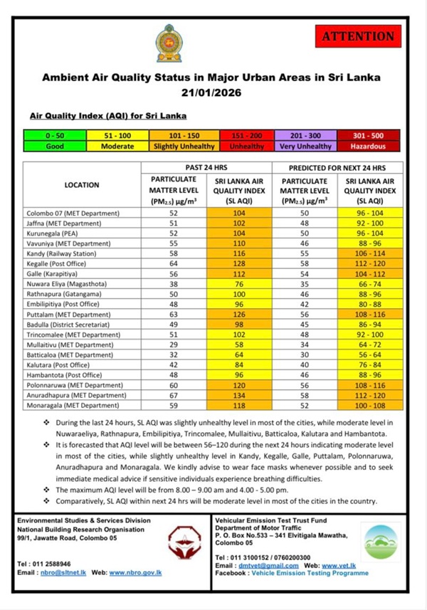 The National Building Research Organization (NBRO) says Sri Lanka’s air quality reached a slightly unhealthy level in most of the cities in the last 24 hours.