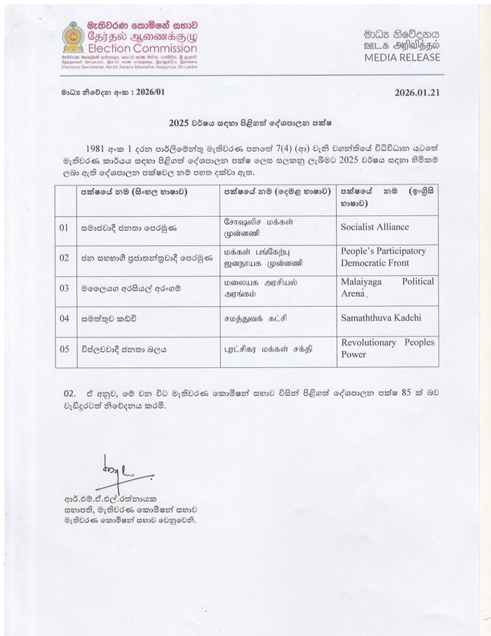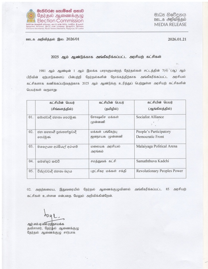 The newly registered political parties are the Socialist Alliance, People’s Participatory Democratic Front, Malaiyaga Political Arena, Samaththuva Kadchi, and Revolutionary Peoples Power. (Newswire)