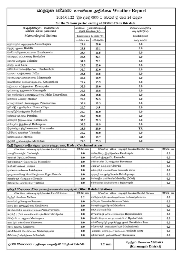 Rainfall was minimal across the island, with most stations reporting no measurable rain. The highest recorded rainfall was 1.2 mm at Mellawa in the Kurunegala District.