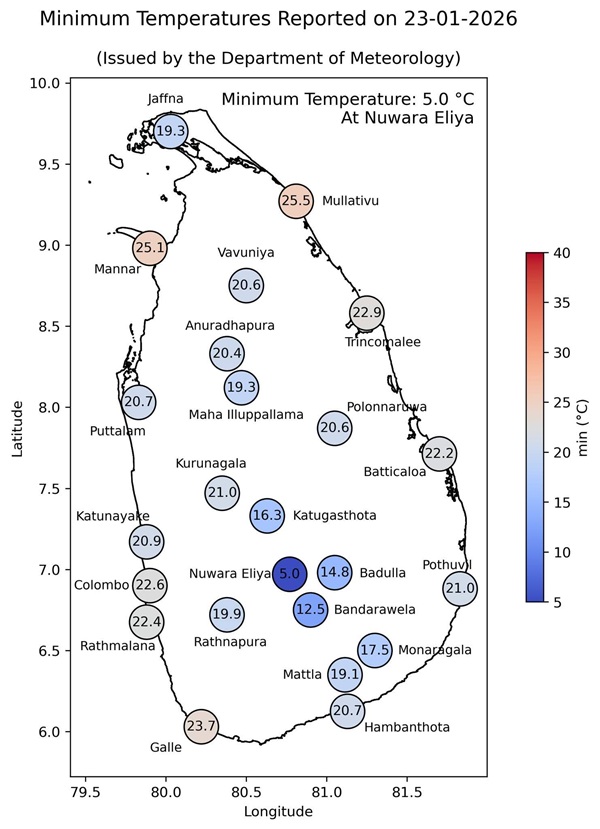 The Department of Meteorology reported that Sri Lanka’s lowest minimum temperature today (23 Jan) was recorded at 5.0 degrees Celsius in Nuwara Eliya, according to early morning observations.