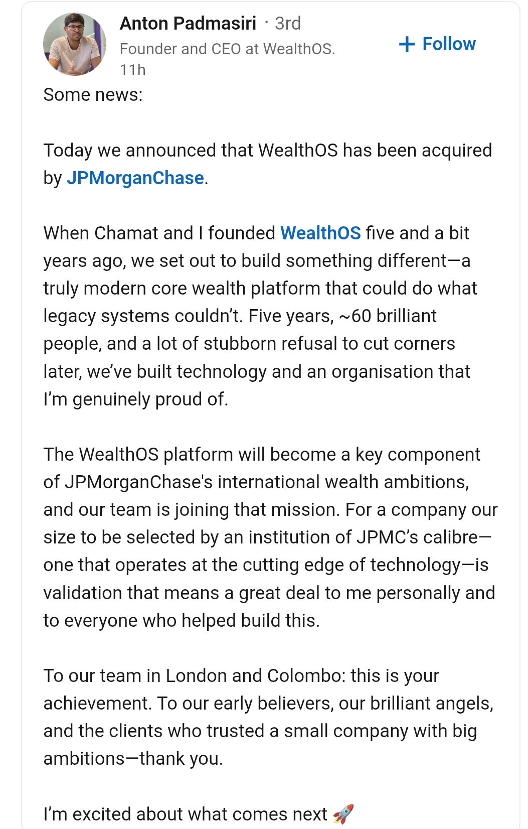 WealthOS, headquartered in the United Kingdom, was co-founded by Sri Lankan entrepreneurs Anton Padmasiri and Chamath Arambawela, and maintains a significant engineering and product team in Sri Lanka. Staff in both the UK and Sri Lanka are expected to join JPMorgan following the acquisition.