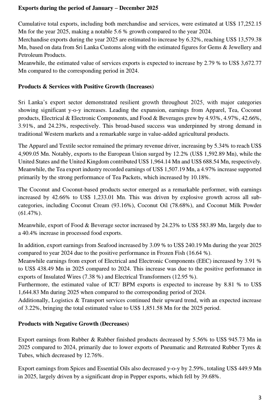 Sri Lanka’s export sector continued its positive growth momentum in 2025, recording a notable y-o-y growth of 5.6 %. Based on Sri Lanka Customs statistics and estimated export figures for Gems and Jewellery, Petroleum Products, and services, total export earnings reached US$ 17,252.15 Mn in 2025, reflecting sustained growth and improving external trade conditions.