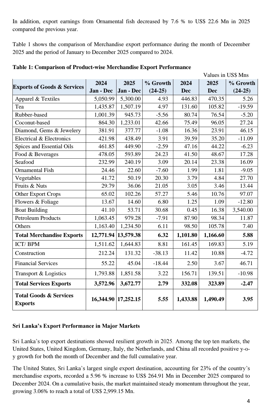 In December 2025, merchandise exports recorded a 5.88 % y-o-y increase, reaching US$1,166.60 Mn, according to provisional data of Sri Lanka Customs, including estimated figures for Gems and Jewellery and Petroleum Products. For the full year 2025, merchandise export earnings amounted to US$13,579.38 Mn, reflecting a 6.32 % increase compared to 2024.