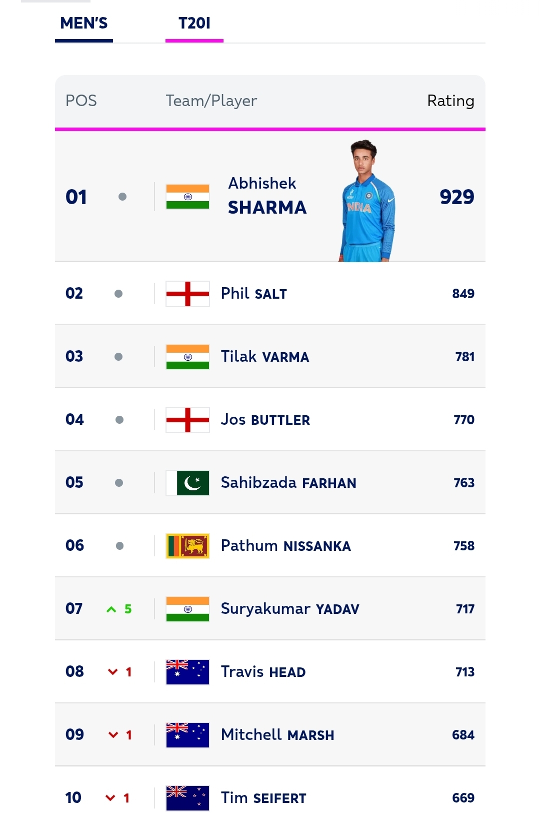 The former No.1 batter struck scores of 32, 82 not out and 57 not out to climb the table, as India dominate the upper reaches of the rankings with Abhishek Sharma at the summit and Tilak Varma in third position, just 10 days out from the ICC Men’s T20 World Cup 2026.