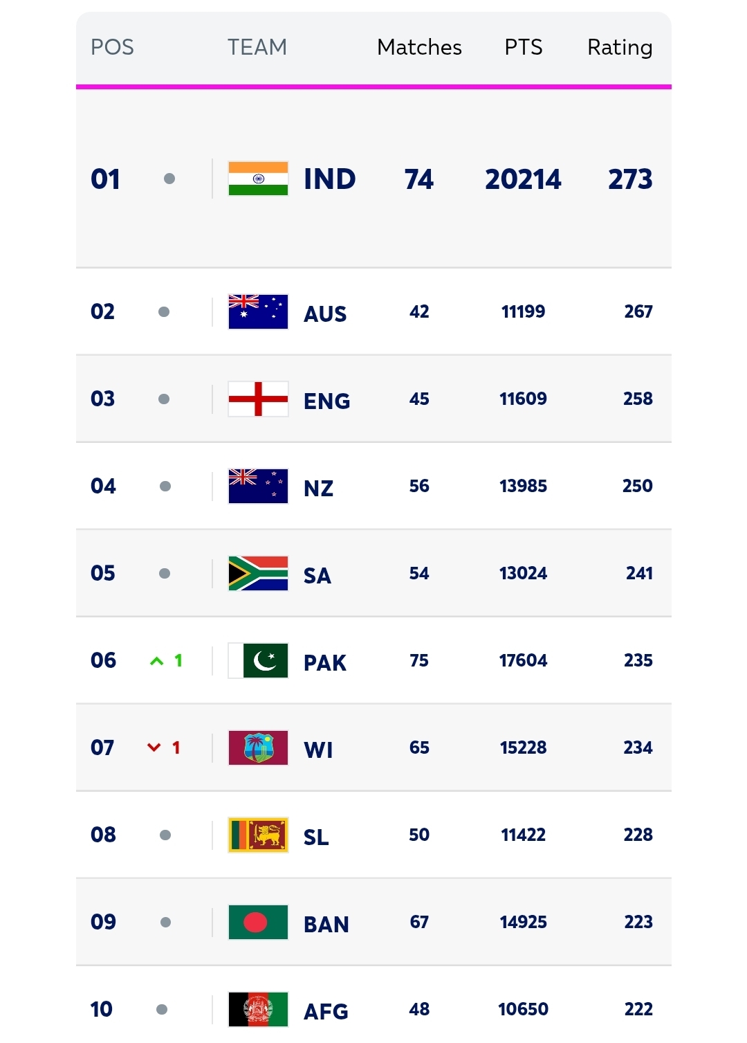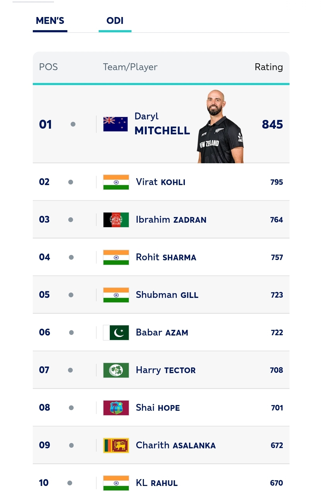 Afghanistan openers Ibrahim Zadran and Rahmanullah have also made significant gains after a productive run during their 2-1 series win over the West Indies in Dubai. Ibrahim has moved up two places to 13th and Rahmanullah is up three places to 15th even as Player of the Series Darwish Rasooli has progressed 29 slots to 87th position after aggregating 156 runs.